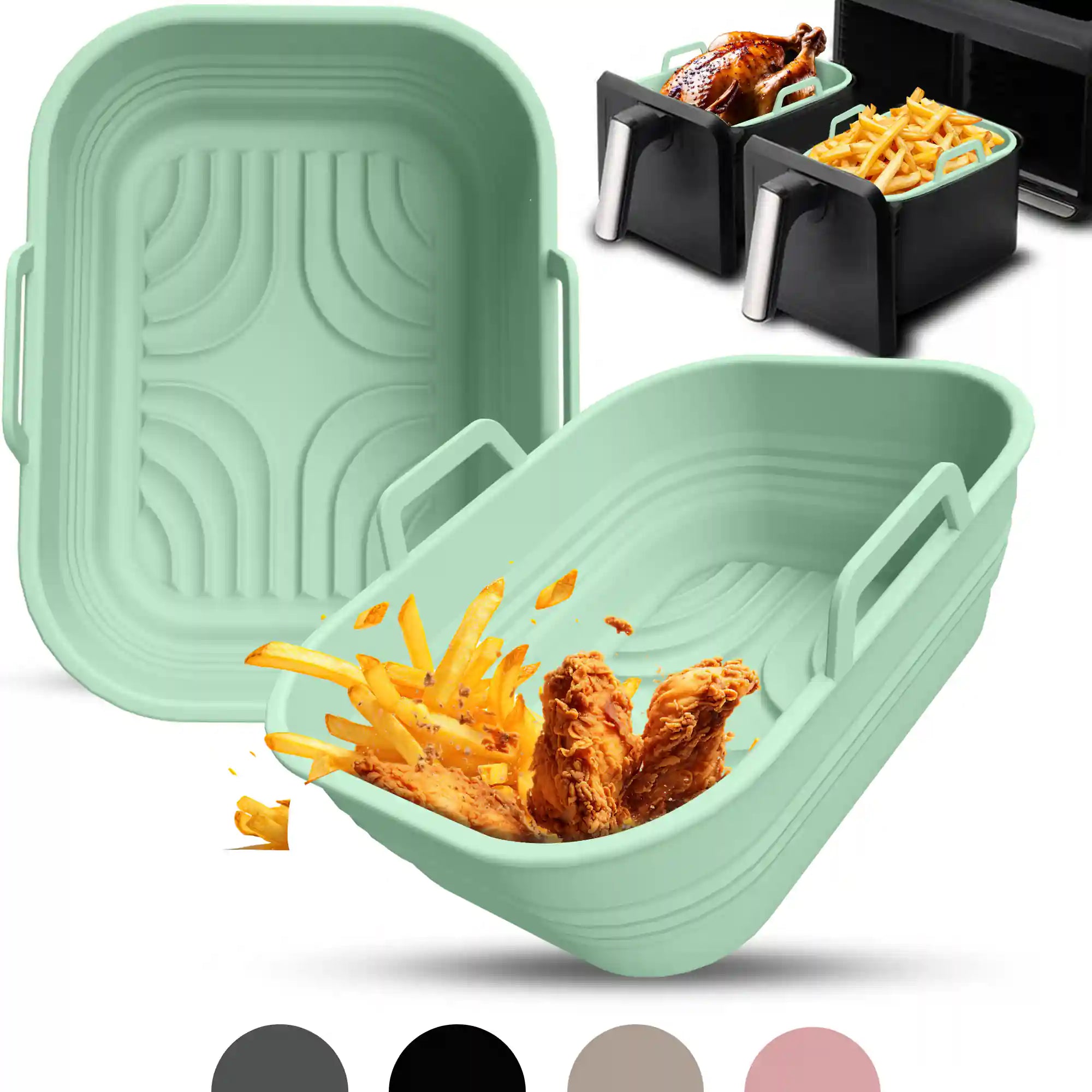 Entdecke unsere hochwertigen faltbaren Silikonformen, die speziell für den Ninja Dual Zone entwickelt wurden. Genieße knusprige, perfekt gegarte Speisen, ohne dir Gedanken über die Reinigung des Ninja Airfryers machen zu müssen. Dank der passgenauen Silikonformen entfällt das umständliche Einfetten und Reinigen des Airfryers. Einfach die Form in die beiden Körbe des Ninja Dual legen, dein Rezept zubereiten und nach dem Gebrauch mühelos abwaschen. So sparst du Zeit und Aufwand und kannst dich ganz auf den Genuss konzentrieren!